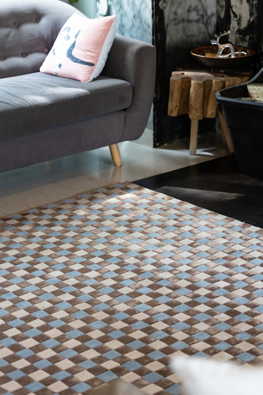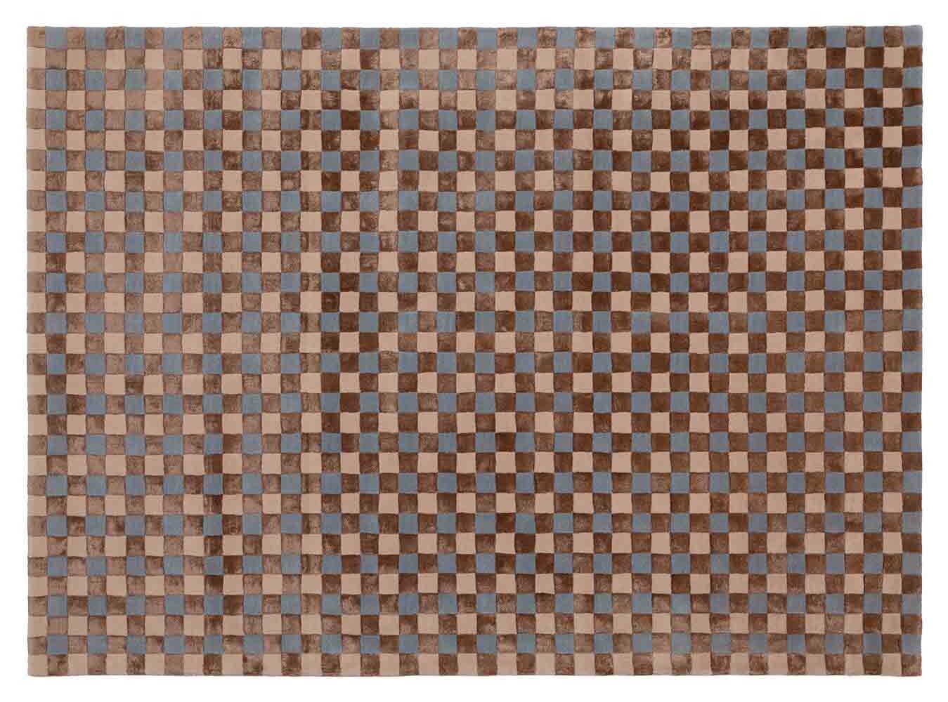 Dywan wełniany w niebiesko-beżowo-brązową szachownicę FLICKER BLUE BEIGE BROWN 5016 zachwyci Cię designem i sposobem tkania.